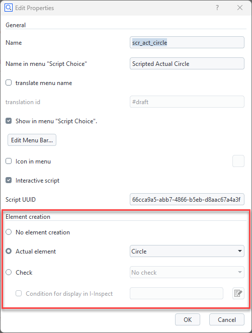 You can set different properties to a script in the script editor. For scripted elements, the “Element creation” section provides drop-down menus to select the element type.