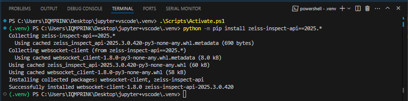 2. In the Terminal, activate the virtual environment and run python -m pip install zeiss-inspect-api==2025.*